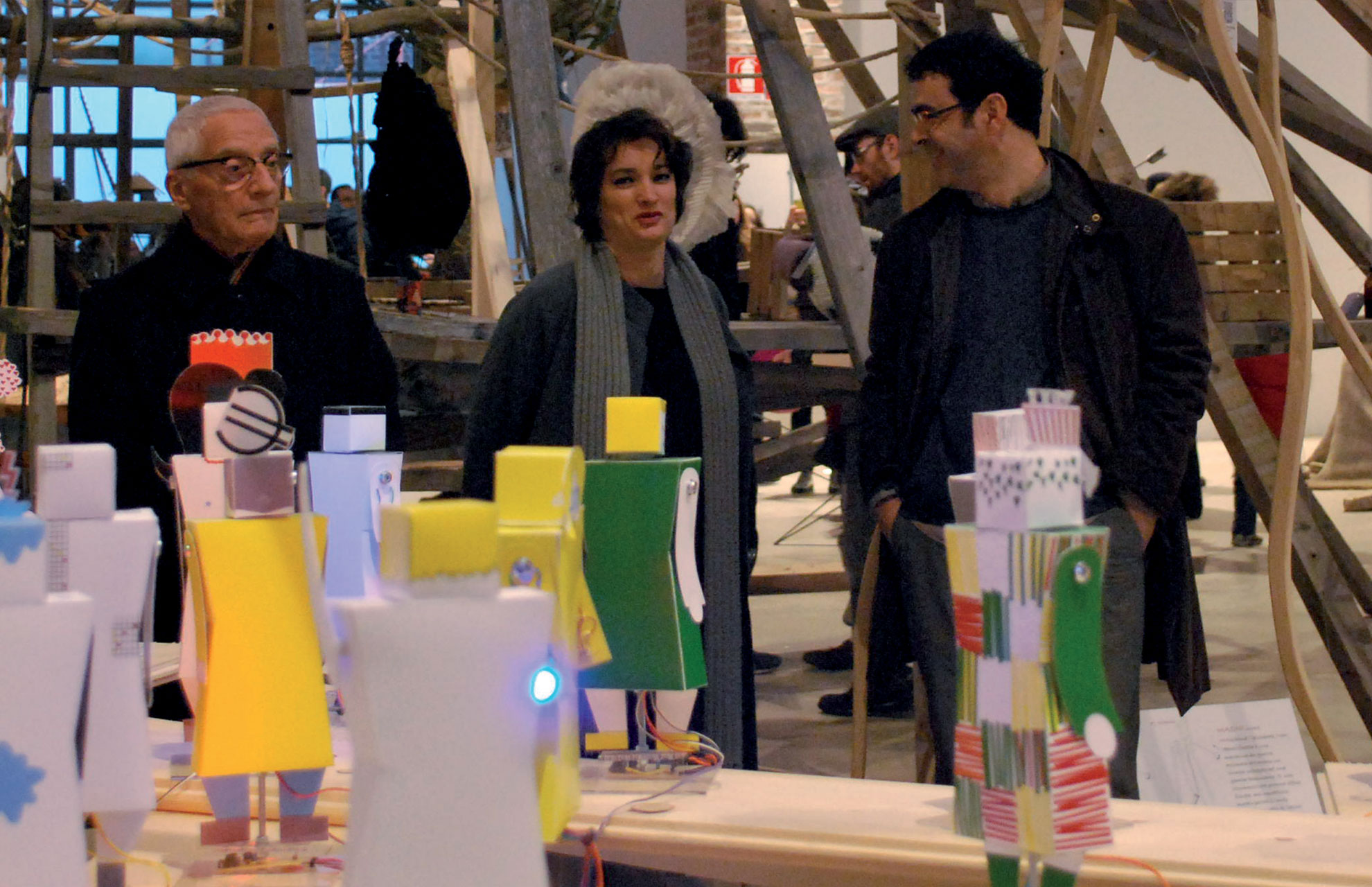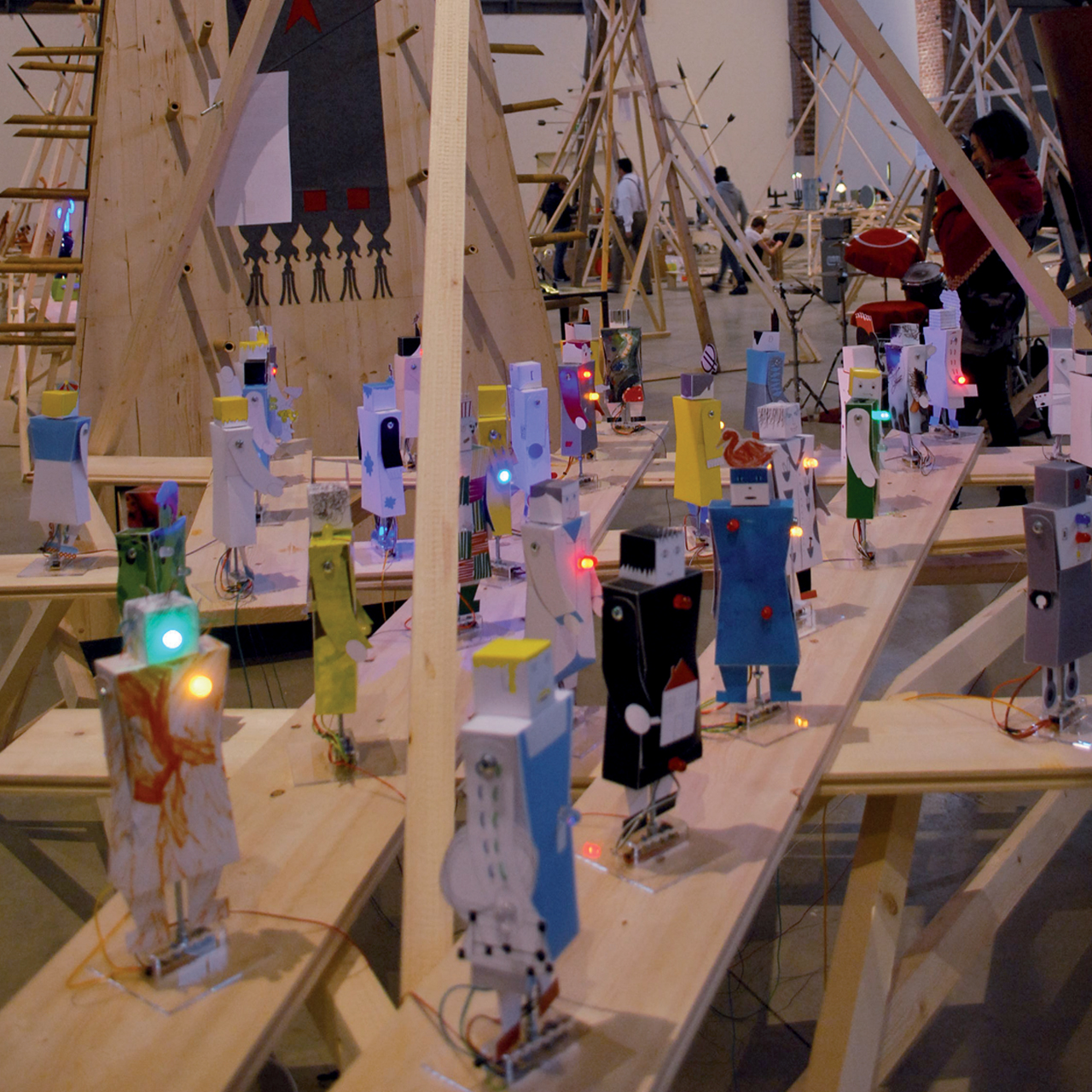 Drawing their dreams, producing objects to support their practices. They are no longer just buying objects of representation. The army is made of Robots for children, made from children's drawings, for them to learn how to make: assemblies, programs, drawings, exchange of ideas. Head and arms can be exchanged, they move, there are LEDs... Children can draw their models.