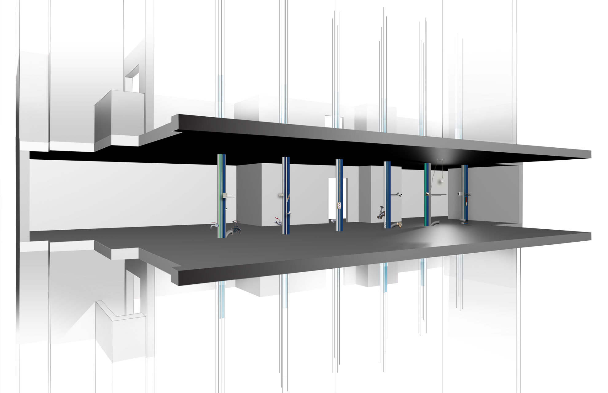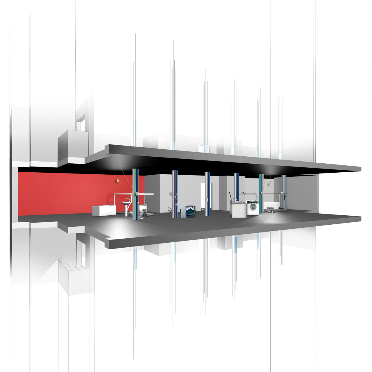 Gli abitanti di HOM(m)E hanno la possibilità di metamorfosare a piacimento la configurazione del loro spazio privato, non solo in base alle loro esigenze ma anche ai loro desideri e stati d'animo. In questo modo, diventano i veri inventori della loro domesticità e, di conseguenza, della loro vita. In termini pratici, la progettazione dello spazio si basa sulla flessibilità e sulla manovrabilità degli elementi, che si "agganciano" letteralmente alla colonna vertebrale. Questo processo potrebbe essere paragonato a quello dei giochi di costruzione come il Meccano. Tutti gli elementi, presenti e futuri, fanno parte di questo stesso processo di innesto, siano essi mobili (ganci italici, lampade a sospensione, ecc.), attrezzature (elettrodomestici, ecc.) o elementi decorativi. Essendo il risultato di una produzione industrializzata che favorisce la flessibilità e la modularità, possono essere assemblati à la carte a seconda del momento e, inoltre, offrono una scelta tra una vasta gamma, o addirittura permettono di creare un arredamento su misura per il proprio ambiente.