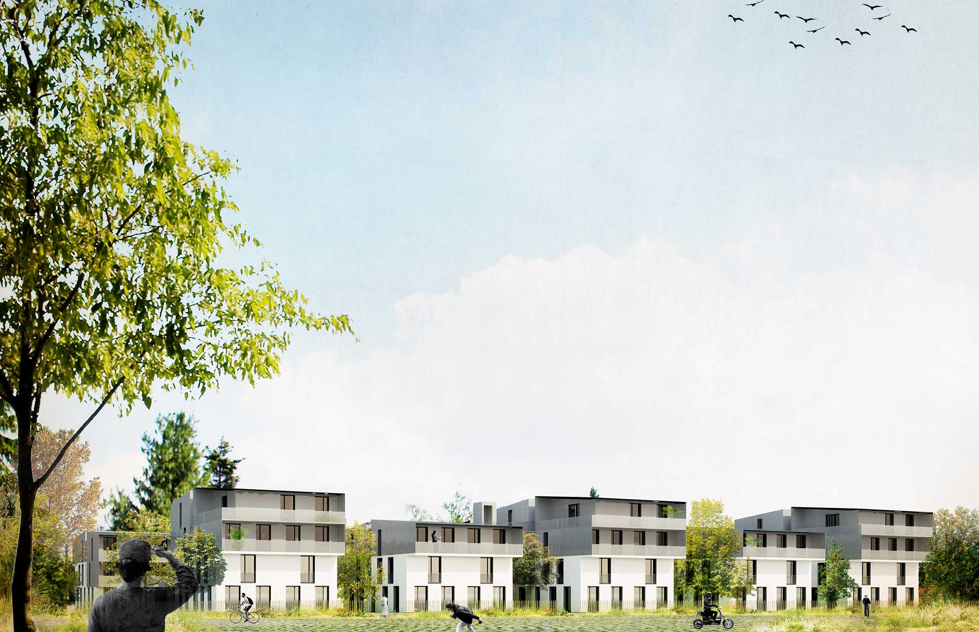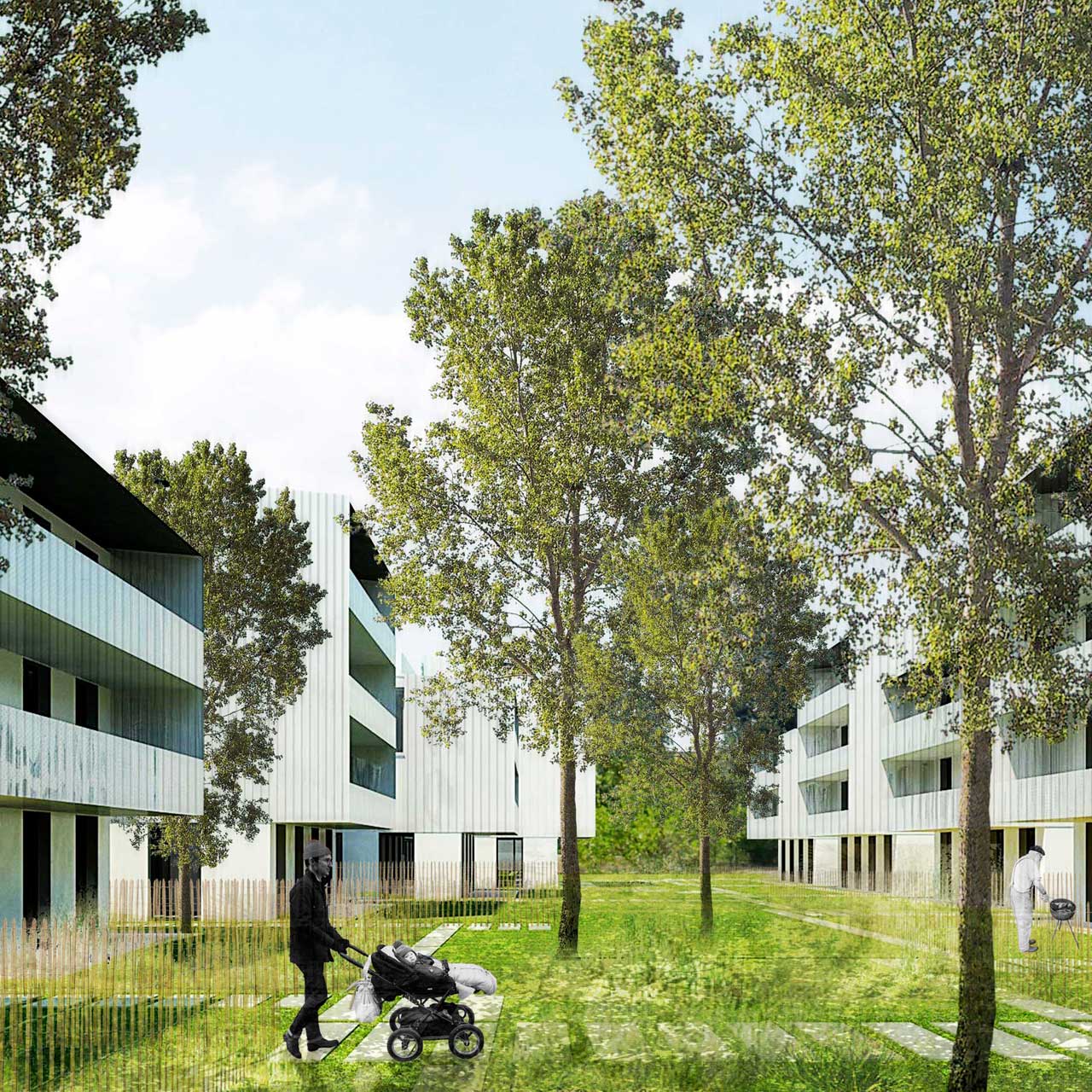 This porosity is also reflected in the position of the project's volumes. Each villa on the ground floor (R+3) and its opposite on the ground floor (R+2) are designed to allow unobstructed views. A series of "footbridges" links each of the floors, providing "communal gardens" overlooking the ground floor villas (R+2). All of the flats on the upper floors benefit from large balconies with views over the parkland of the Vieux Bois. The urban character of the street-facing facades is asserted by the use of masonry materials such as concrete or brick to create a solid, anchored base, supporting one or more storeys. This materiality is intended to provide a strong foundation for the project in an open landscaped area.