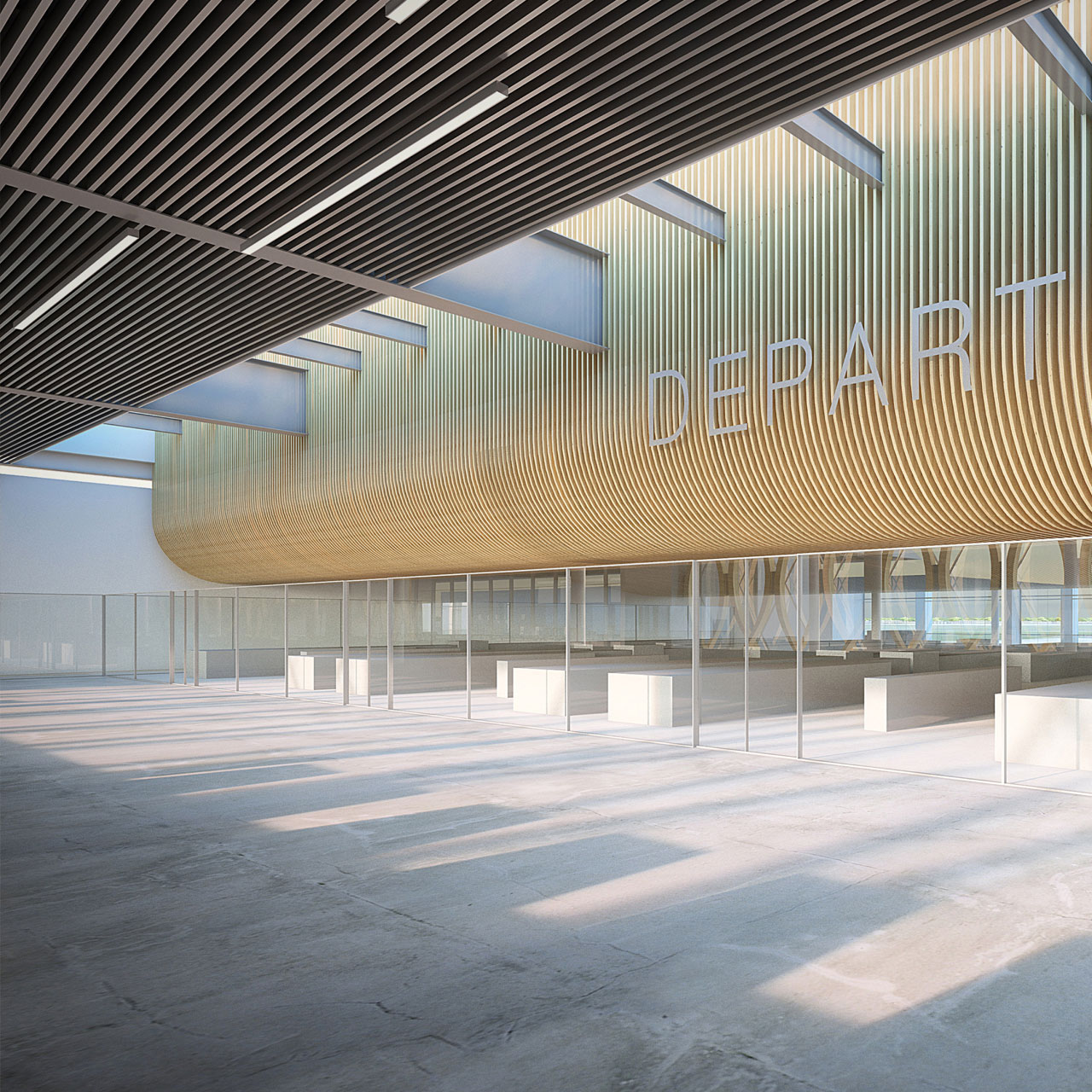 Expansion on the basis of the nodal plug-in is a real technical challenge. Extending an airport means undertaking an organisation that envisages possible evolutions. The project therefore proposes the removal of a wall to maintain continuity in the spatial arrangement, and it is from this plug-in principle that the building takes shape. The wooden supporting structure, easily extendable, makes a future transformation of the airport possible. The arched linearity, inscribed around the runways of the old and future buildings, allows the circulation of passengers, the different zones and their functionalities, both security and technical, to be maintained intact; in the same way that the new piers are articulated with the runways and the link with the airport space. The site thus responds to different problems: technical difficulties, passenger flow, various zones with different functions, while making sense through the precision of their architectural links, thought out in an overall logic.