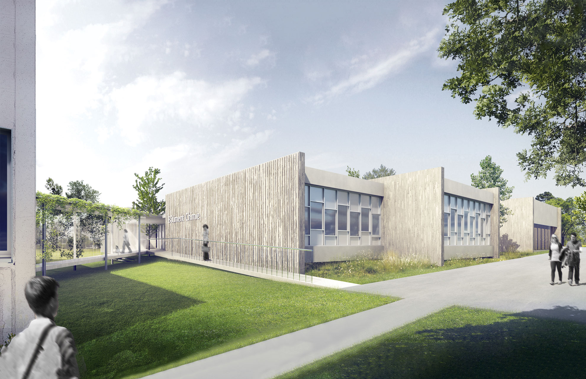 This dialogue between architecture and garden is based on a simple construction: large partition walls made of structured concrete organise sections within which the elements of a garden are found: patio, planted pathways, etc. Concrete was chosen for its materiality, which recaptures the idea of a masonry wall with the appearance of the stone that marks the heart of the city of Poitiers. Between two concrete walls, a largely glazed facade opens up perspectives on the garden elements by providing natural lighting. All the rooms benefit from this natural quality of light. The plot of land devoted to the project is only visible after passing through a first building or along a second building. The entrance is via the first existing building, in accordance with the programme's requirements, through a planted walkway connected to the complex and opening onto a wide landing for students in a shaded area. The organisation is designed in functional sections: a first section which receives users in street clothes, a second section which contains all the practical work rooms, a third section which groups together the analysis rooms, and finally, a fourth section occupied by the technical premises and the offices of the preparators, as well as the common preparation room. This structure, with a partition wall and a simple garden, makes it possible to extend to additional modules with a surface area of 300 m2 for the future programme by renewing this organisation on the south-western part.