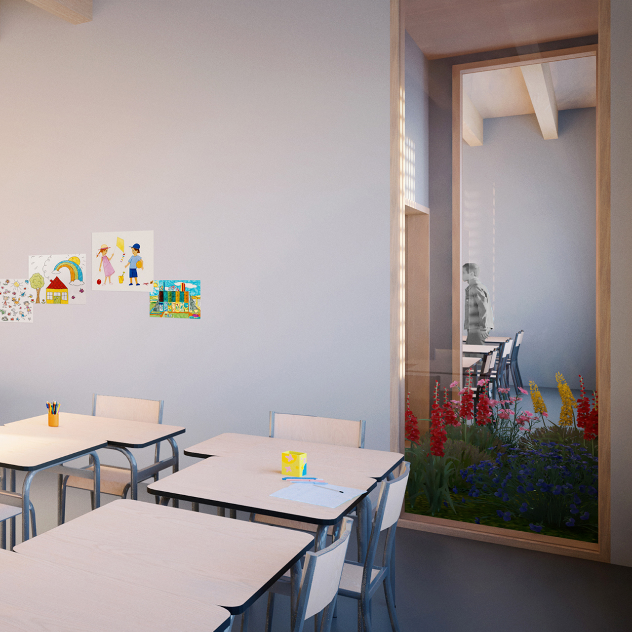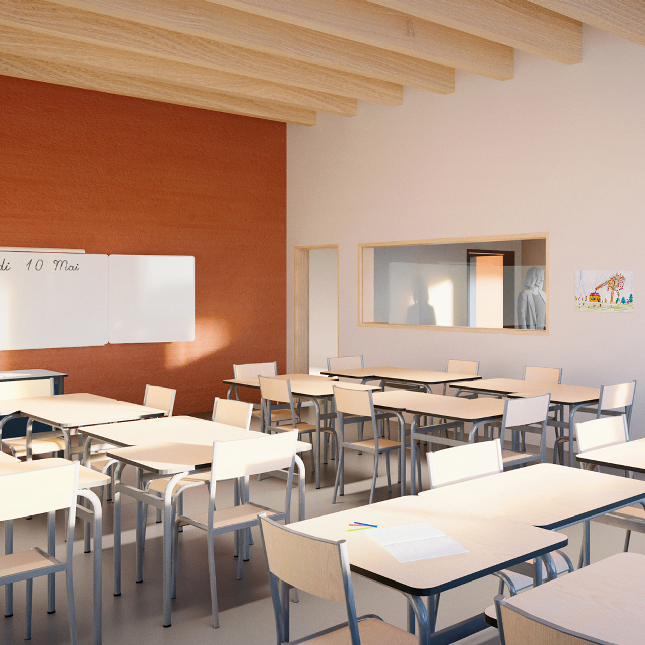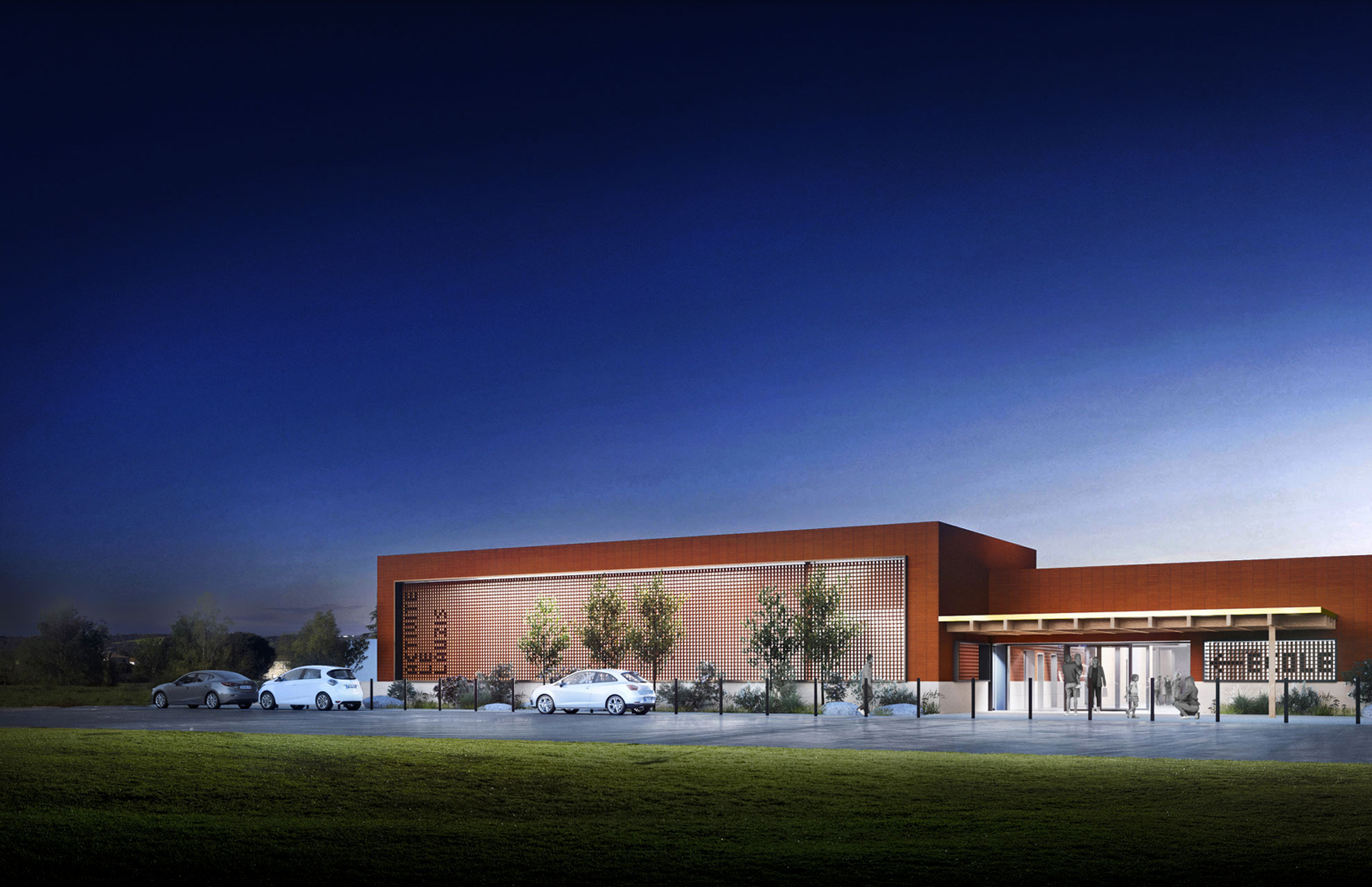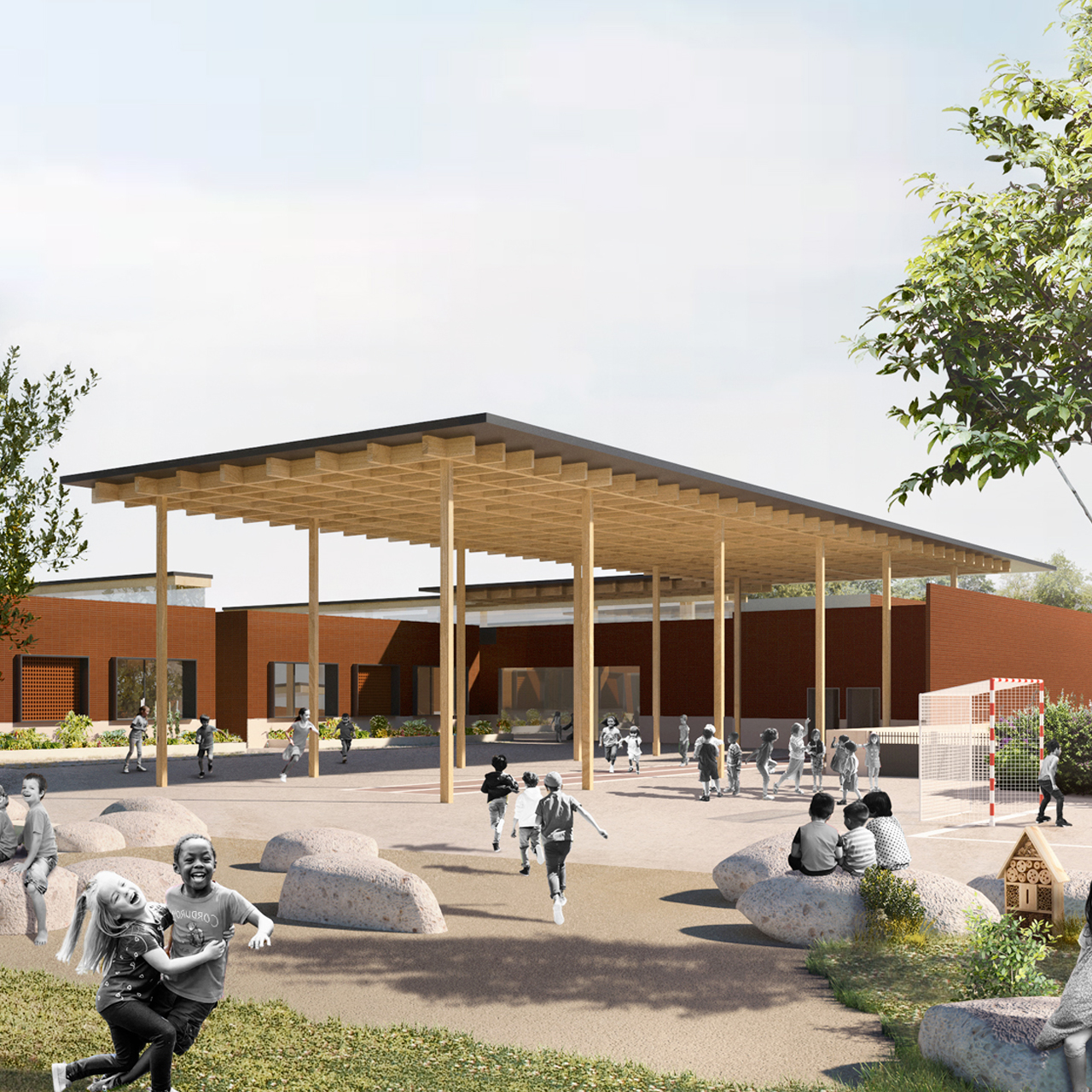 The project will initially focus on the valley, making it safer for children and avoiding fencing off the area. This area is landscaped with a strong link to nature as an extension of the existing meadow. The building is distinguished by a twin volume marked by a shared forecourt with a canopy overhanging the esplanade to orchestrate a double entrance, that of the school and the multi-activity room. Signage on the facade directs users to their destination, organising a differentiated pedestrian flow. Inside, mud walls keep the building cool. The playground is laid out around a cooling island in line with the playground.