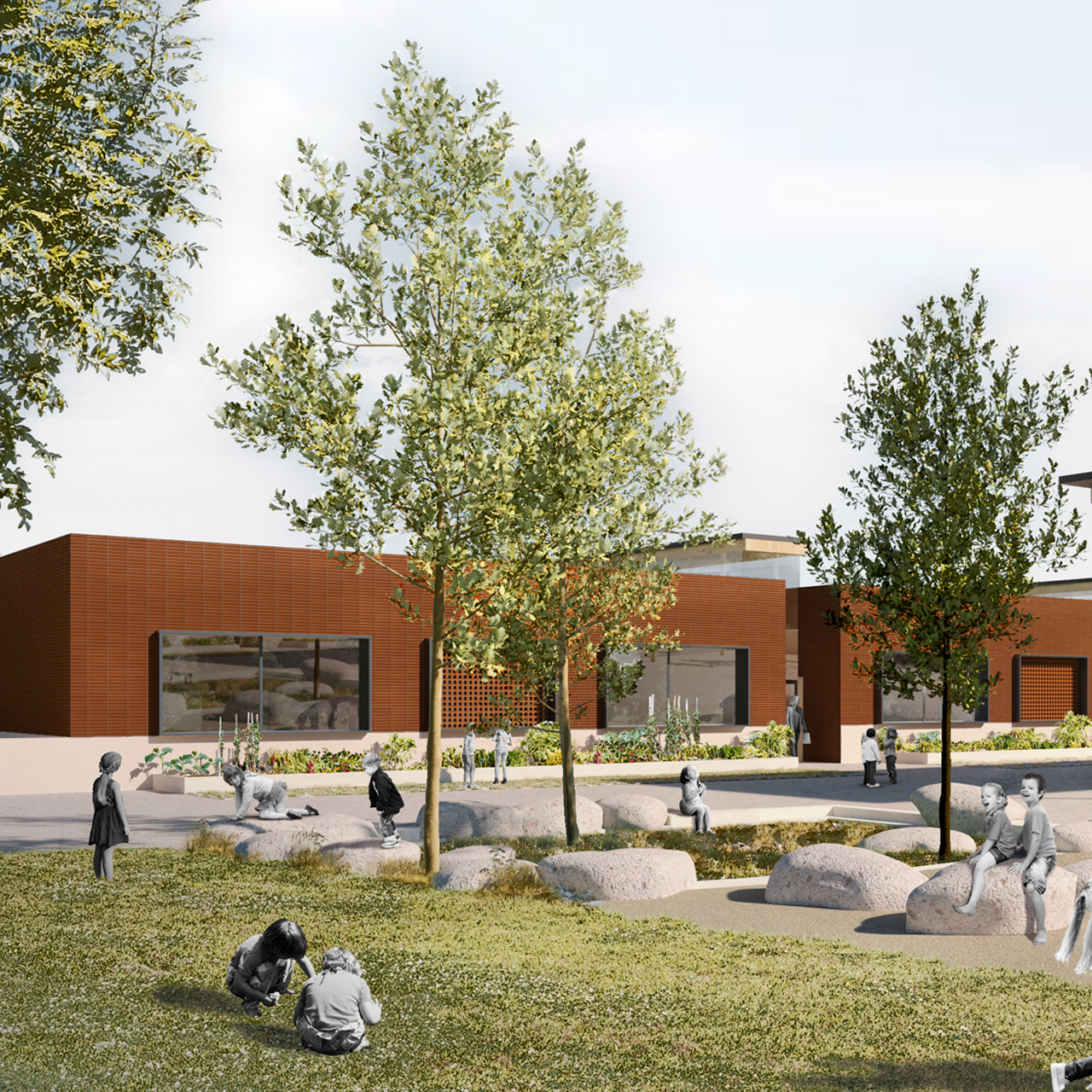 The commune of Gragnague is launching a project to build a primary school and an adjoining activity room, on a site at the heart of the Lauzis urban development, an area undergoing change and densification. The site comprises two plots, one measuring 4,337 m2 and the other 1,663 m2. The smaller parcel is 40% occupied by grassland in a ditch. The application includes consideration of a connection between the educational establishment and the Les Petits Artistes studio housed on a lot further down the road. The orientation of the site means that the building has to be significantly set back from the land to prevent excessive sunlight.