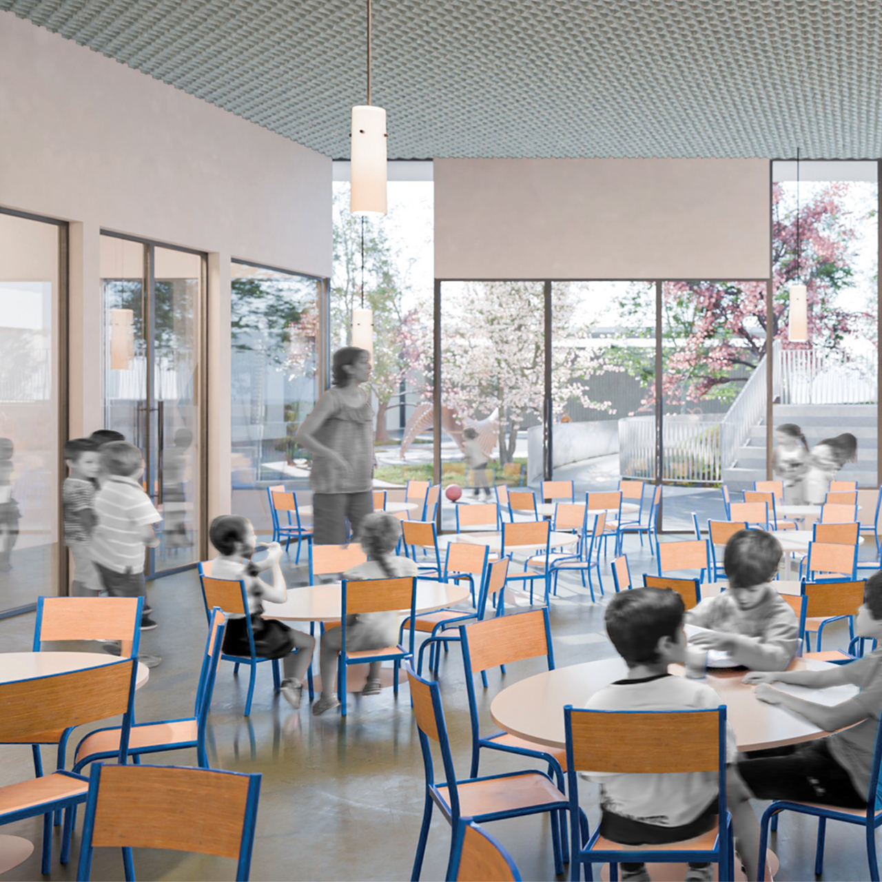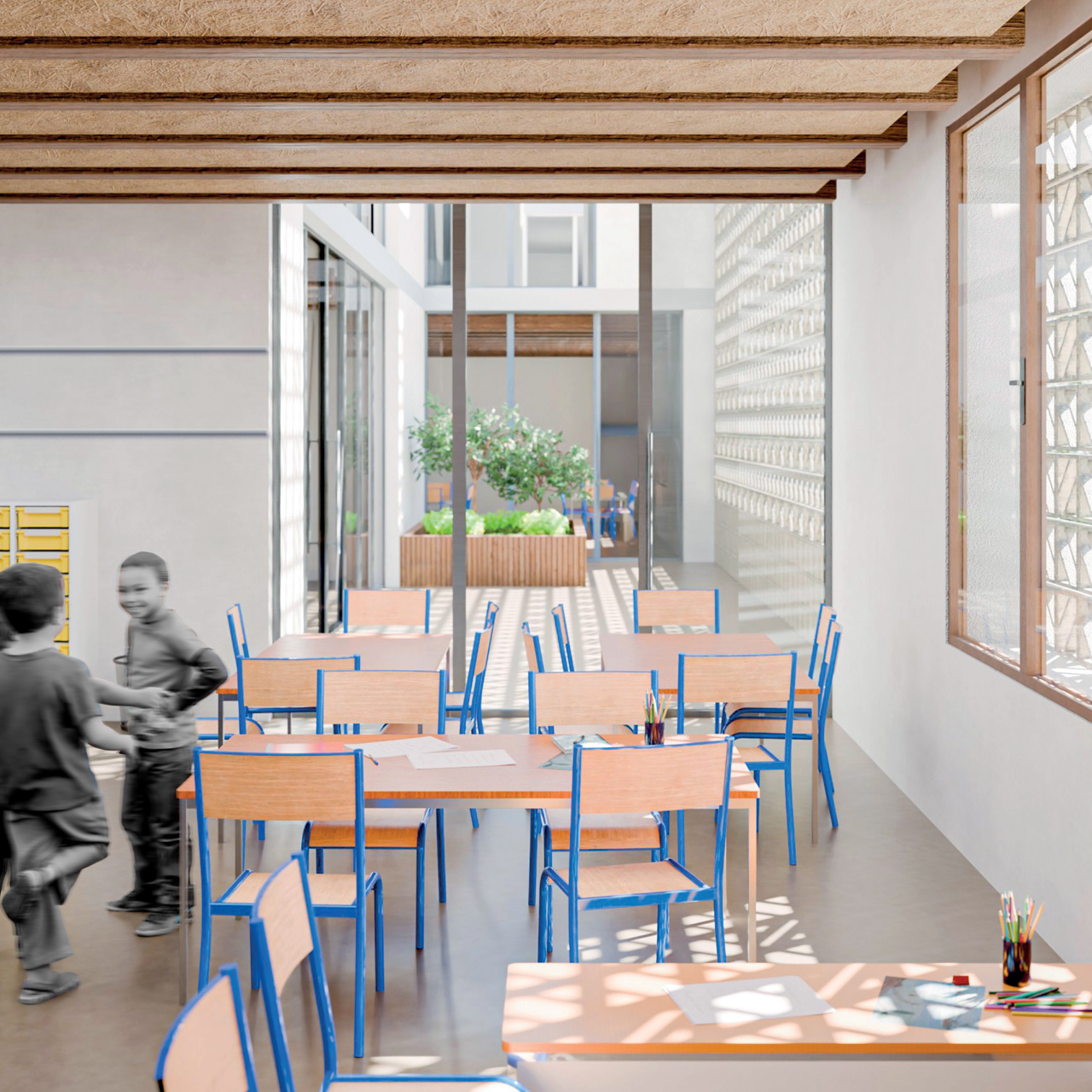 Un bâtiment public marque un engagement important sur un territoire. Une école pose une pierre pour les générations à venir. En somme, une école publique joue un rôle essentiel dans l’accompagnement d’une éducation cohérente et équitable pour tous les enfants, qui favorise le développement social et intellectuel de la société. L’ensemble comprend des salles de classe, des salles d’activités, des cours de récréation, des terrains de sport, une bibliothèque, des réfectoires. Conçu pour être accessible à tous, le groupe scolaire, dès son entrée, accueille et invite les enfants par la courbe du mur de la façade recouverte d’un auvent bien lumineux. Cette ambiance conviviale autorise une surveillance du CLAE par sa position centrale. À l’intérieur de l’école, l’esthétique est axée sur l’hospitalité et la fonctionnalité. L’usage de couleurs naturelles et chaleureuses dialogue avec la végétation à travers des perspectives ouvertes.