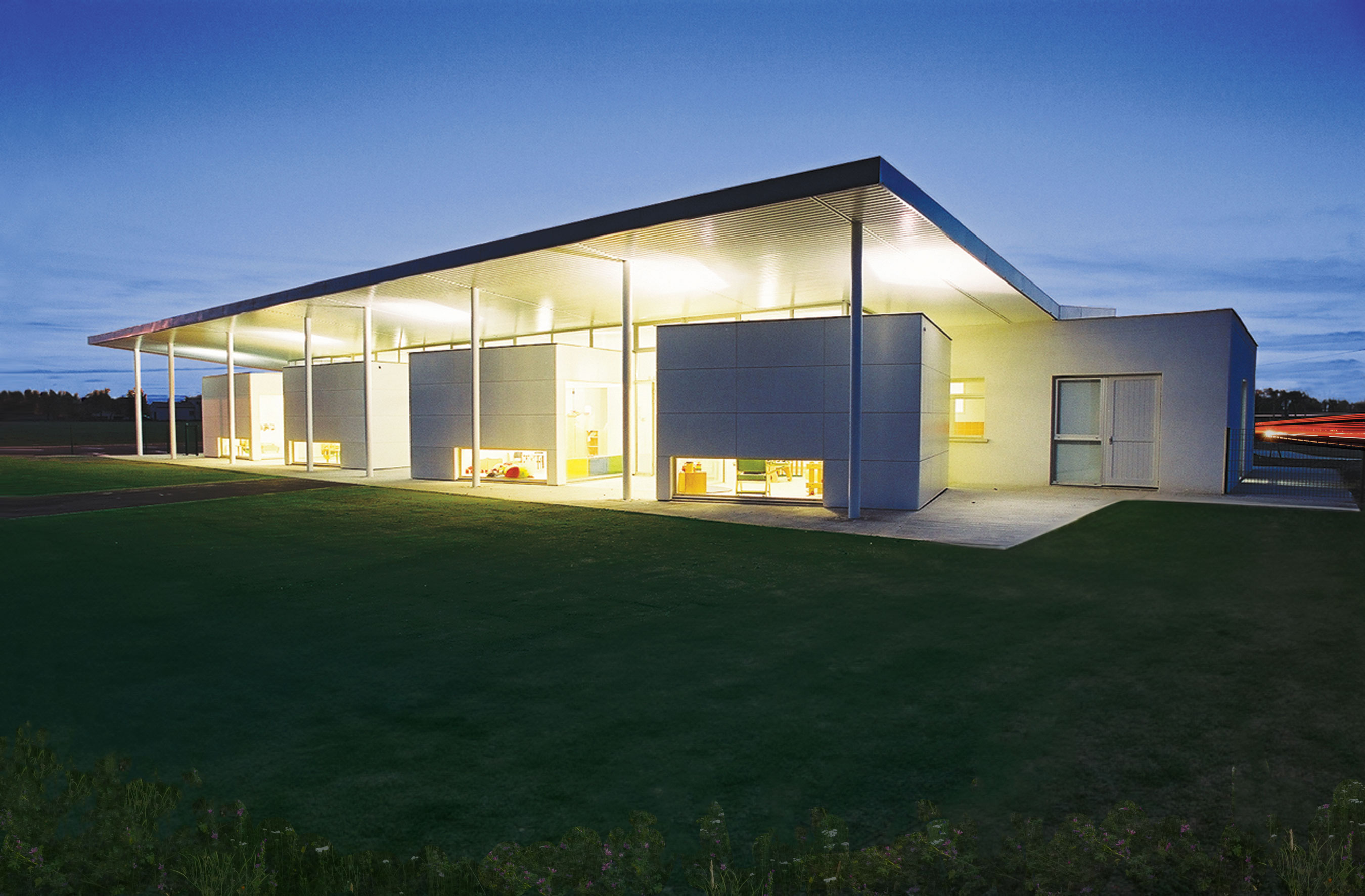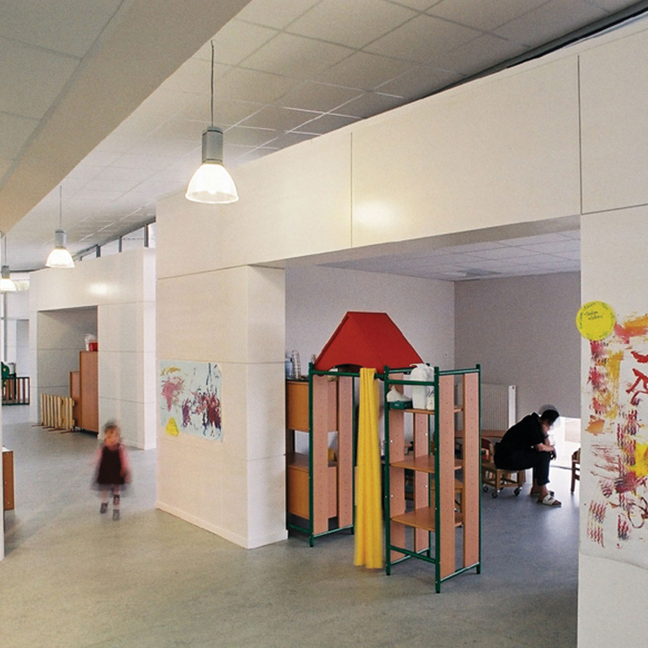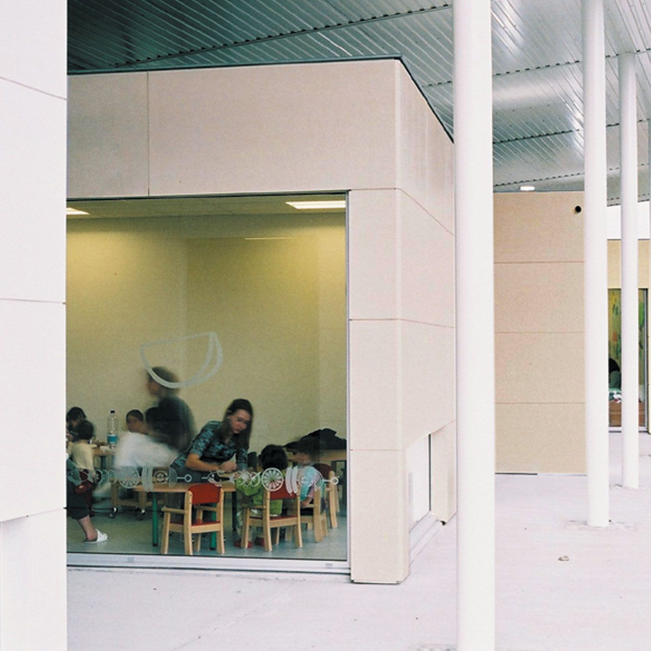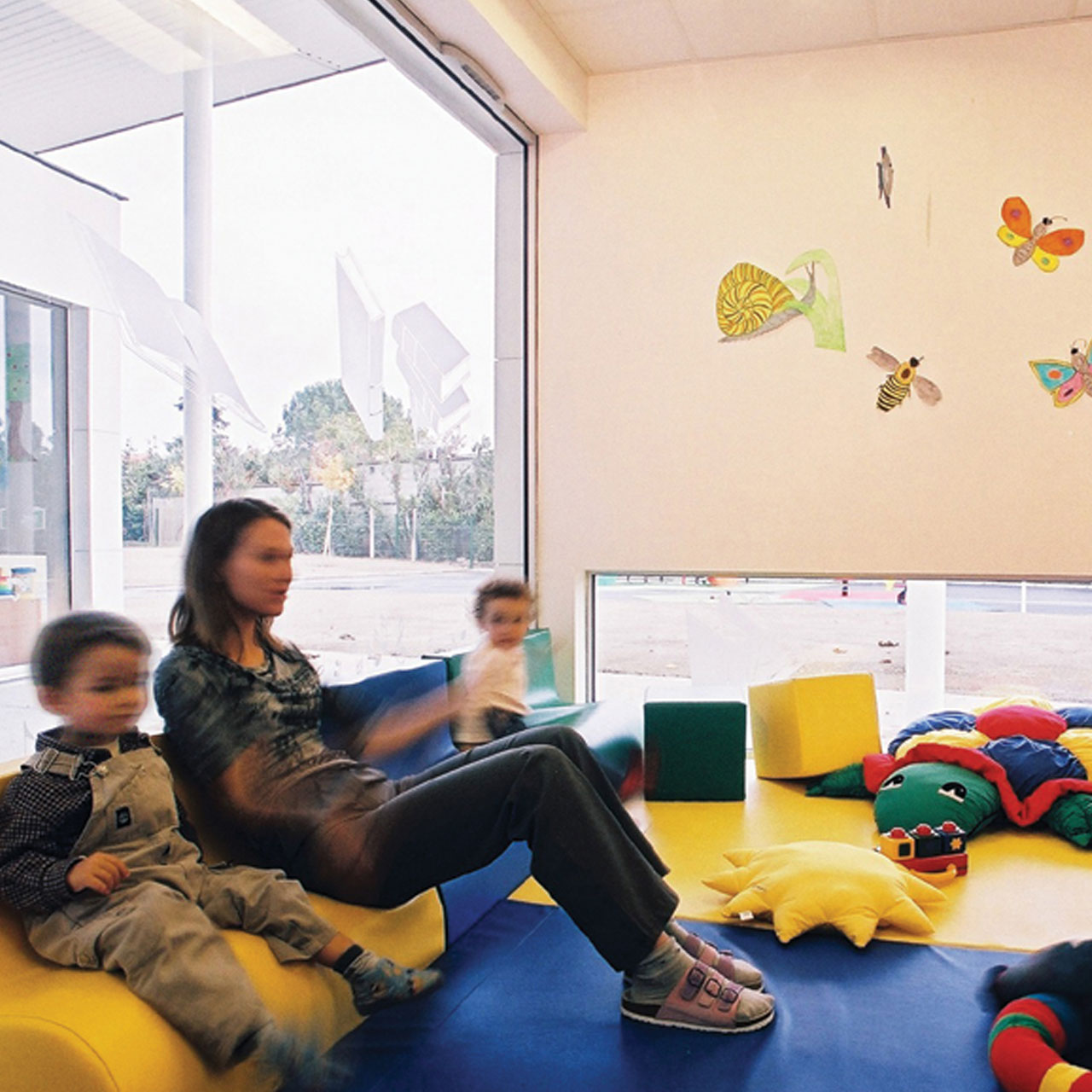 Un asilo nido ospita bambini e adulti. La scala di questi corpi include un adattamento spaziale a diverse dimensioni e corpi che è stata la forza trainante del progetto. La progettazione degli spazi di attività è pensata dal punto di vista delle dimensioni del corpo dei bambini secondo le prospettive derivate dal loro uso a quattro zampe, o dalla loro altezza in piedi. La dimensione corporea degli adulti è considerata secondo il loro lavoro funzionale, la supervisione e lo sviluppo dell'attività del vivaio. Un'applicazione di vernice della marca Merck sulle scatole offre un cambiamento di colore secondo il percorso del sole. Le scatole sono orientate secondo il percorso del sole e coprono il grande spazio abitativo con una maschera naturale. Ognuno di loro beneficia di un angolo particolare, con aperture rivolte l'una verso l'altra, risolvendo così i problemi di luce del sole e migliorando le interazioni visive. La striscia superiore vetrata fornisce una luminosità controllata su tutta la profondità degli spazi dedicati ai bambini, offrendo luce naturale nei corridoi. Il tutto si articola intorno a un grande volume centrale coperto da un tetto rovesciato. Le sale di attività si sviluppano in volumi semplici, giocando con i confini interni/esterni.