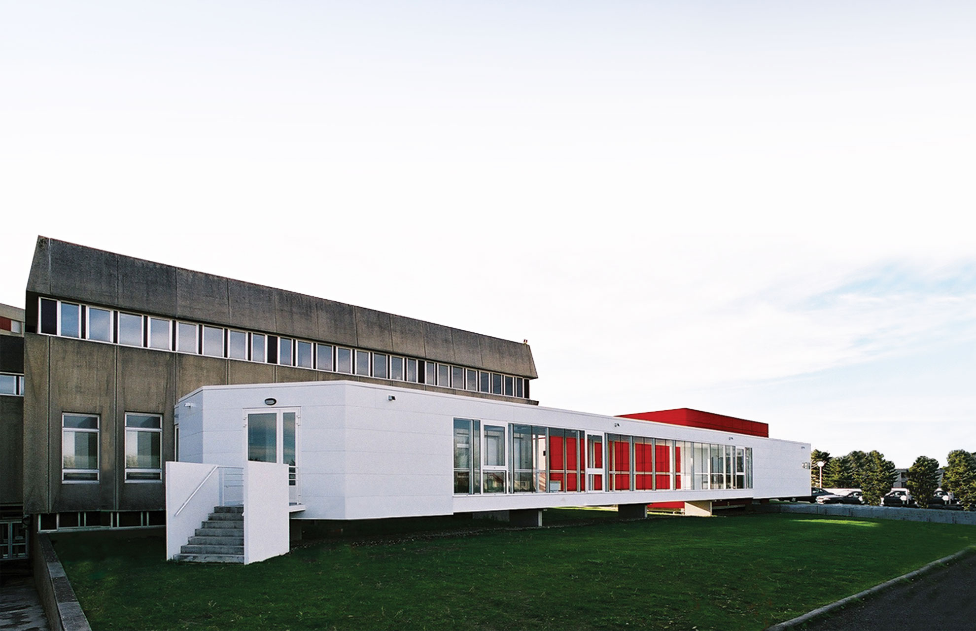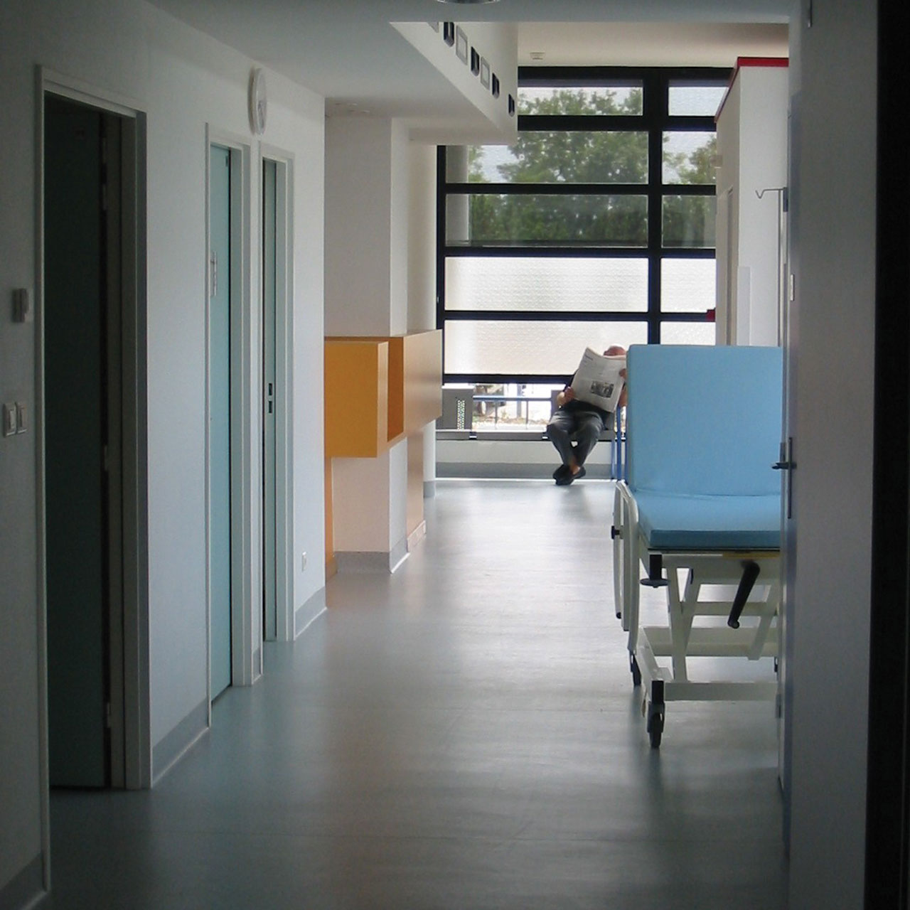 Questo progetto riguarda due mondi: uno pubblico, l'ospedale; l'altro privato, dovendo trovare la giusta articolazione tra le esigenze degli operatori in entrambe le sfere. Per questo è stato necessario concepire una giustapposizione piuttosto che un'integrazione fisica. L'ospedale è costruito sul principio di una pianta a forma di Y, con una delle ali che deve già sostenere un'espansione per ospitare diversi servizi. L'aggiunta di un elemento era quindi inappropriata. Per questo la nuova struttura è staccata e composta da due entrate: una direttamente collegata all'ospedale da una galleria di collegamento, l'altra che dà su una piazza. Il collegamento funzionale funge da cordone: una passerella aerea bianca a strapiombo sul terreno, in gran parte vetrata, offre fughe visive. Si avvolge intorno al cuore dell'estensione, invitando gli utenti alla sala comune.