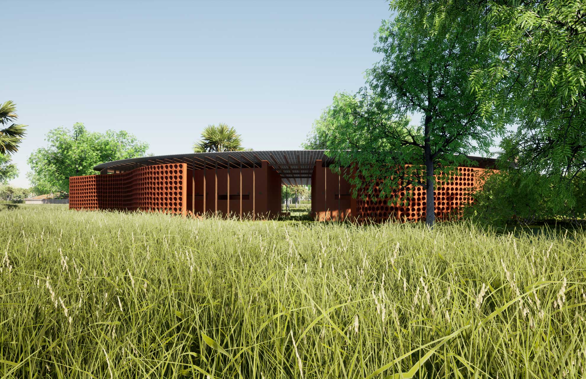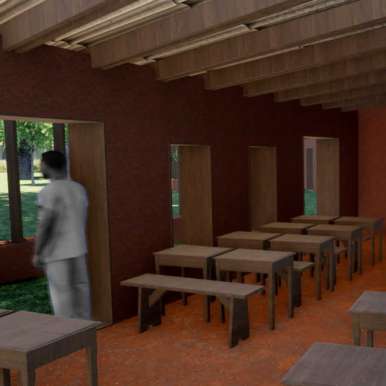 Costruire, lavorando insieme, una scuola basata su un territorio, una cultura, competenze tecniche e conoscenze locali, per essere autonomi nello sviluppo dell'ambiente costruito. Il disegno del progetto concentrico consente la densificazione e l'aumento della superficie all'interno di un volume definito. Il principio rimodella la tipologia vernacolare concentrica, intorno alla vegetazione esistente.